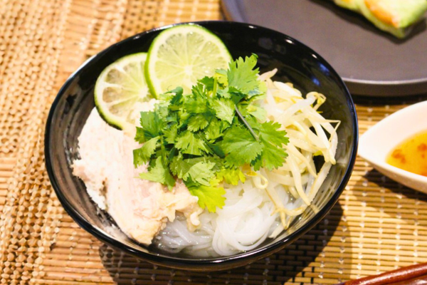 - 4 茹でたフォーを器に盛り、スープを注ぐ。 鶏ハム・もやし・パクチー・ライムを添えて出来上がり。