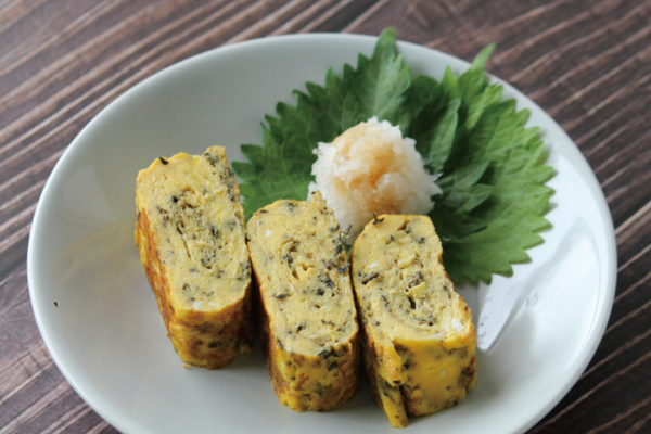 蘇葉の香りがふわっと広がる、やさしい味わいのだし巻き卵。