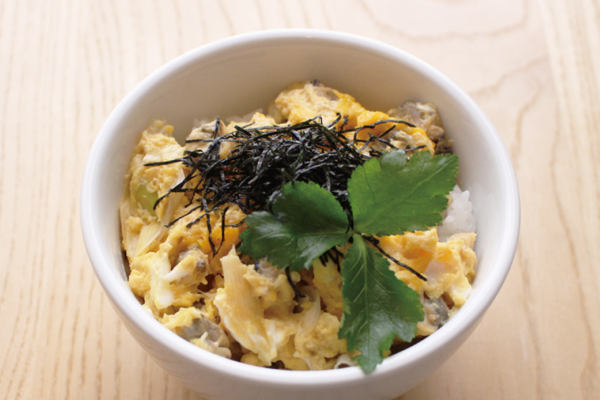 - 4 溶き卵を回し入れ、半熟状になったら火を止める。 丼に盛ったご飯にのせ、三つ葉やきざみのりを添える。