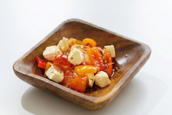 - 2 パプリカ・クリームチーズ・かつお節・オリーブオイル・しょうゆを和える。 器に盛り、仕上げにかつお節を追加して出来上がり。