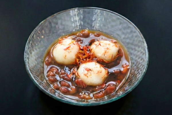 - 6【仕上げ】器にぜんざいを盛り、コーヒーを加える。お好みで紅花を散らす。(白玉を添える場合は一緒に盛る)